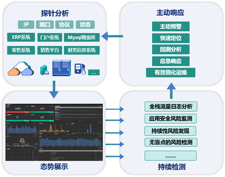 集中式风险监测能力,实时主动检测、搜寻和内部感知、外部威胁。
